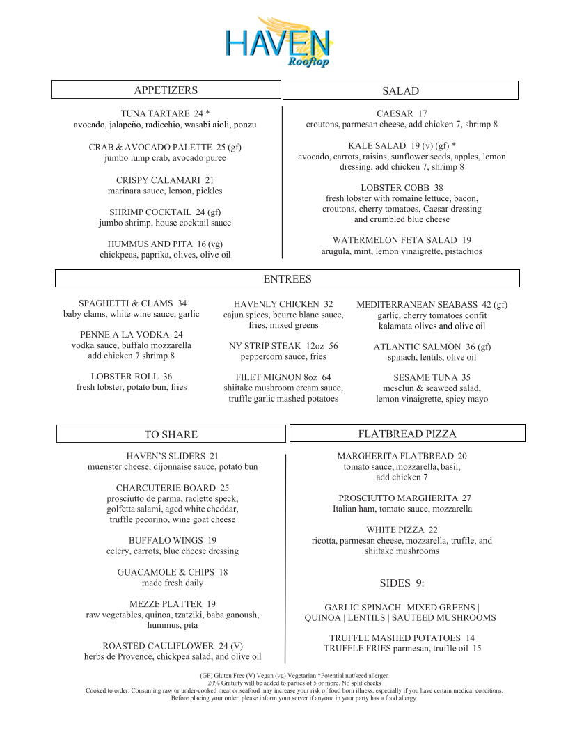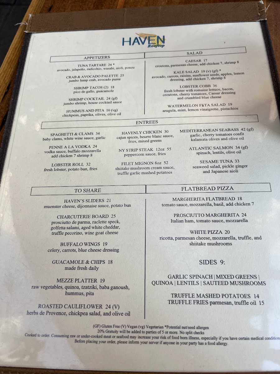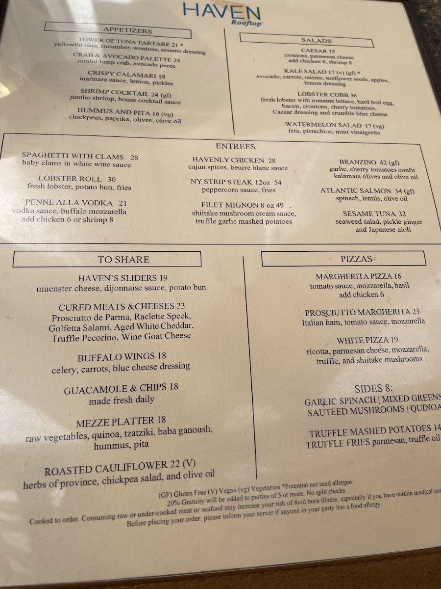 Haven Rooftop specializes in an array of delightful dishes, perfect for those who crave a culinary adventure. Begin your experience with one of their enticing Flatbread Pizzas - the Margherita Flatbread evokes Italy with classic tomato sauce, mozzarella, and fresh basil, while the White Pizza will have your taste buds singing with its rich blend of ricotta, parmesan, and truffle-infused shiitake mushrooms. For those seeking a heartier bite, the Prosciutto Margherita, layered with Italian ham, promises to satiate.